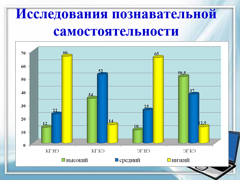 А в экспериментальной группе низкий показатель был почти наравне с контрольной группой 65%, но положительная динамика развития проявилась более эффективно и составило 12,5%, средний показатель тенденции познавательной самостоятельности составил в начале-25%, в конце-37%, степень проявления высокого показателя был в начале эксперимента 10%, в конце 50,5%, что показывает об эффективности проведения уроков с использованием средств ИКТ, чем по традиционному методу проведения учебной деятельности.