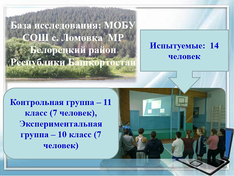 Проект проводился на базе МОБУ СОШ с. Ломовка МР Белорецкий район Республики Башкортостан. В исследовании принимали участие 14 человек, возрастной состав учащихся, составил 15-17 лет. Учащиеся 11 класса (в количестве 7 человек: 3 девушки и 4 юноши) представляли контрольную группу. Учащиеся 10 класса (в количестве 7 человек: 3 девушки и 4 юноши) - экспериментальной группой. Уроки физической культуры в контрольной группе проводились по традиционной методике по программе Ляха. А в экспериментальной группе мы использовали средства ИКТ.