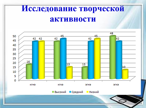 Исследования творческой активности показали, что в контрольной группе состоящей, низкий показатель в начале эксперимента был 42%, а в конце эксперимента-13%, тем самым низкий показатель снизился, средний степень проявления из 42% поднялся на 45% в среднем показателе тоже проявилась незначительная положительная динамика, высокий степень проявления увеличился с 16%, до 42%, контрольная группа, показала положительную динамику формирования познавательной самостоятельности.
