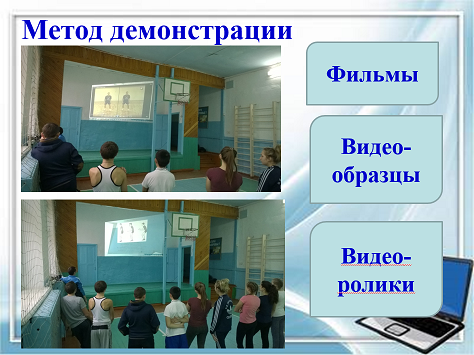 Метод демонстрации. Не каждый учитель владеет техникой или тактикой всех видов спортивных игр, а данный метод позволяет решить все возникающие вопросы с показом данной техники или тактических командных действий. Метод демонстрации включает в себя демонстрацию фильмов, видео-образцов, видео-роликов. Данные видеоролики не занимают много времени (по продолжительности они не более 7 минут), но и могут быть остановлены в любое удобное для рассказчика время.
