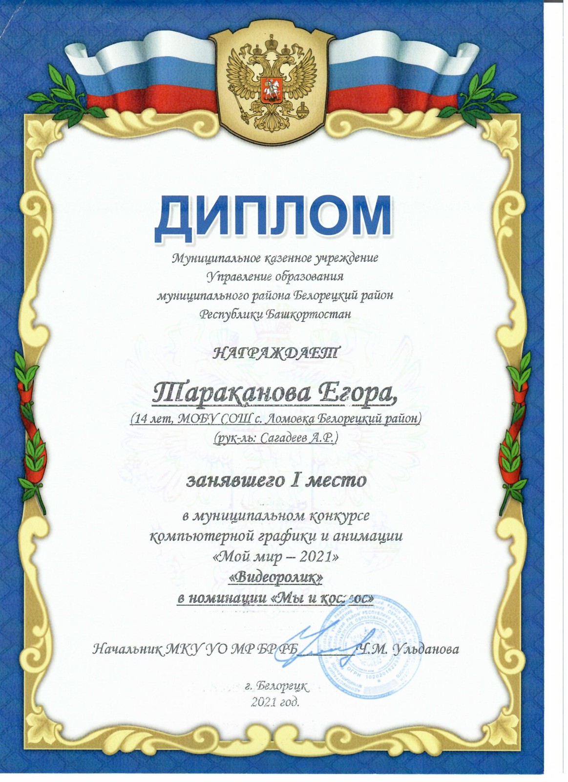 Первое место в муниципальном конкурсе компьютерной графики и анимации "Мой мир - 2021" "Видеоролик в номинации - Мы и...