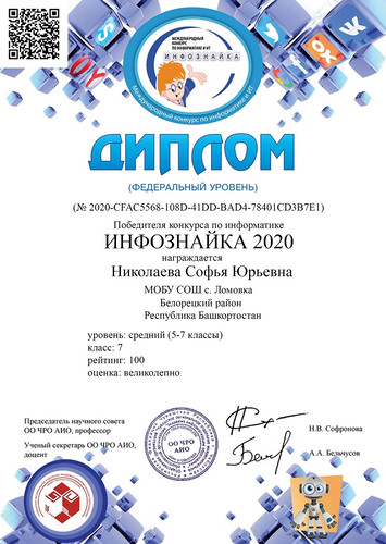 Диплом победителя конкурса по информатике Инфознайка 2020