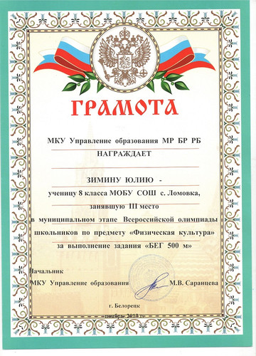 III место за Всероссийскую олимпиаду по физической культуре за выполнение задания "Бег 500 м"